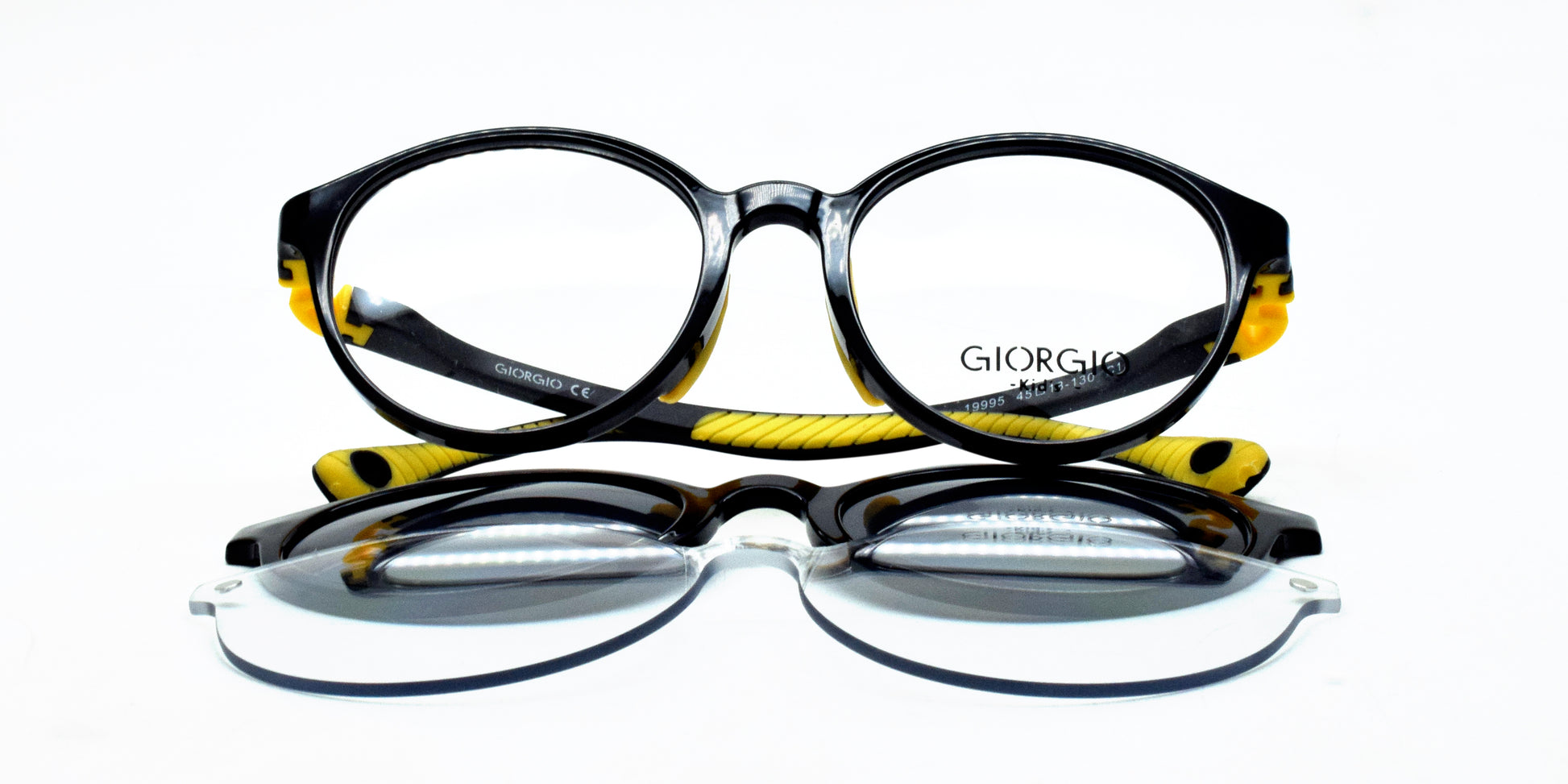 The GIORGIO KIDS 19995 C1 CLIP-ON glasses are perfect for children, featuring a durable acetate frame in a charming Black & Yellow color. With a fixed nose and round shape, they provide a secure fit and full coverage for little ones.