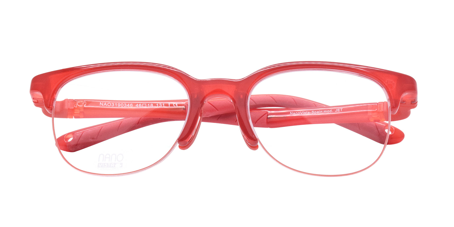 The NANO VISTA JET 3190346 RED 46/18 131 is a child-sized square frame made of durable acetate material. The red color adds a fun touch while the Supra Frame and Fixed Nose design ensure a secure fit. Perfect for little ones learning to see clearly.
