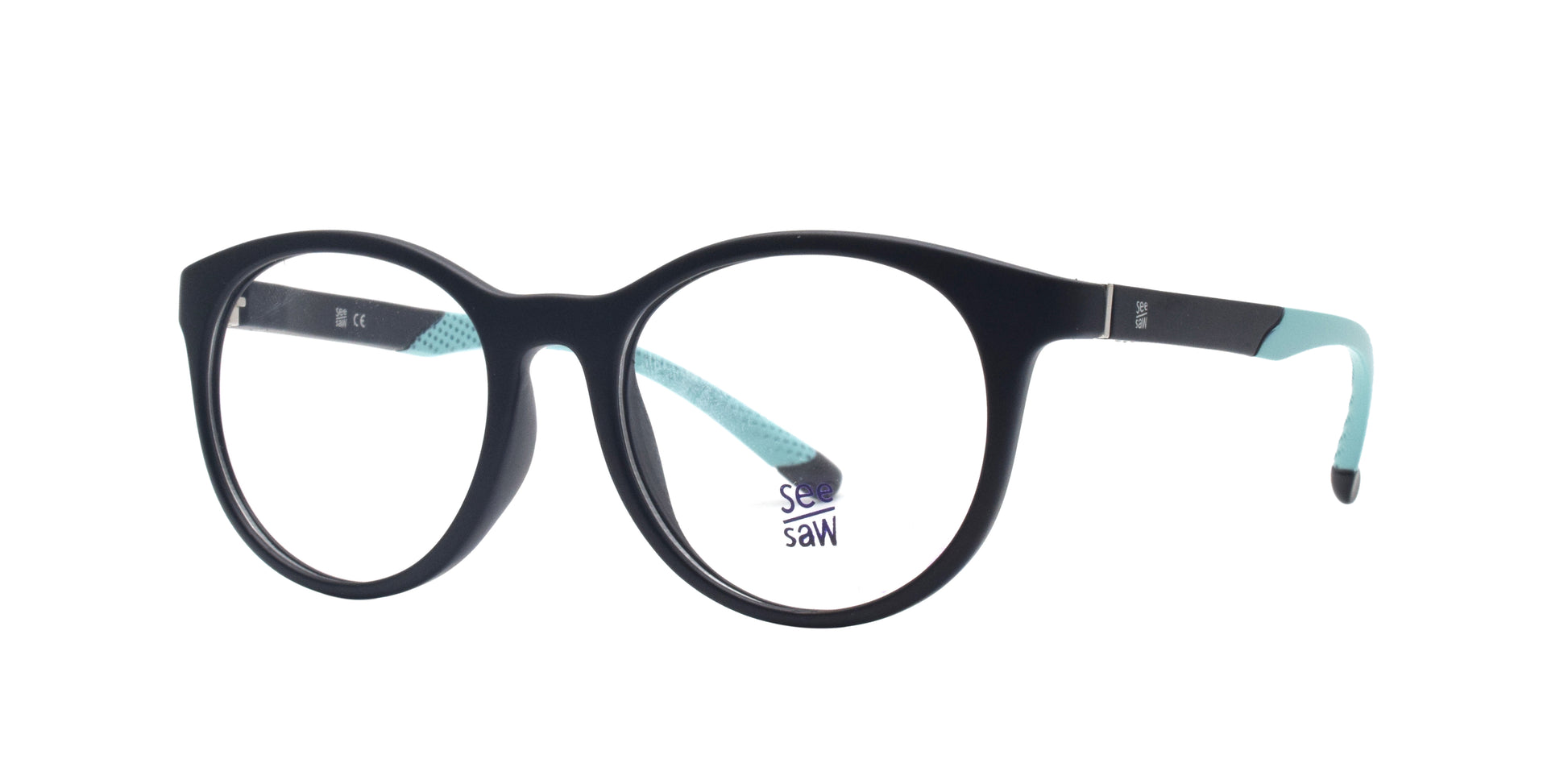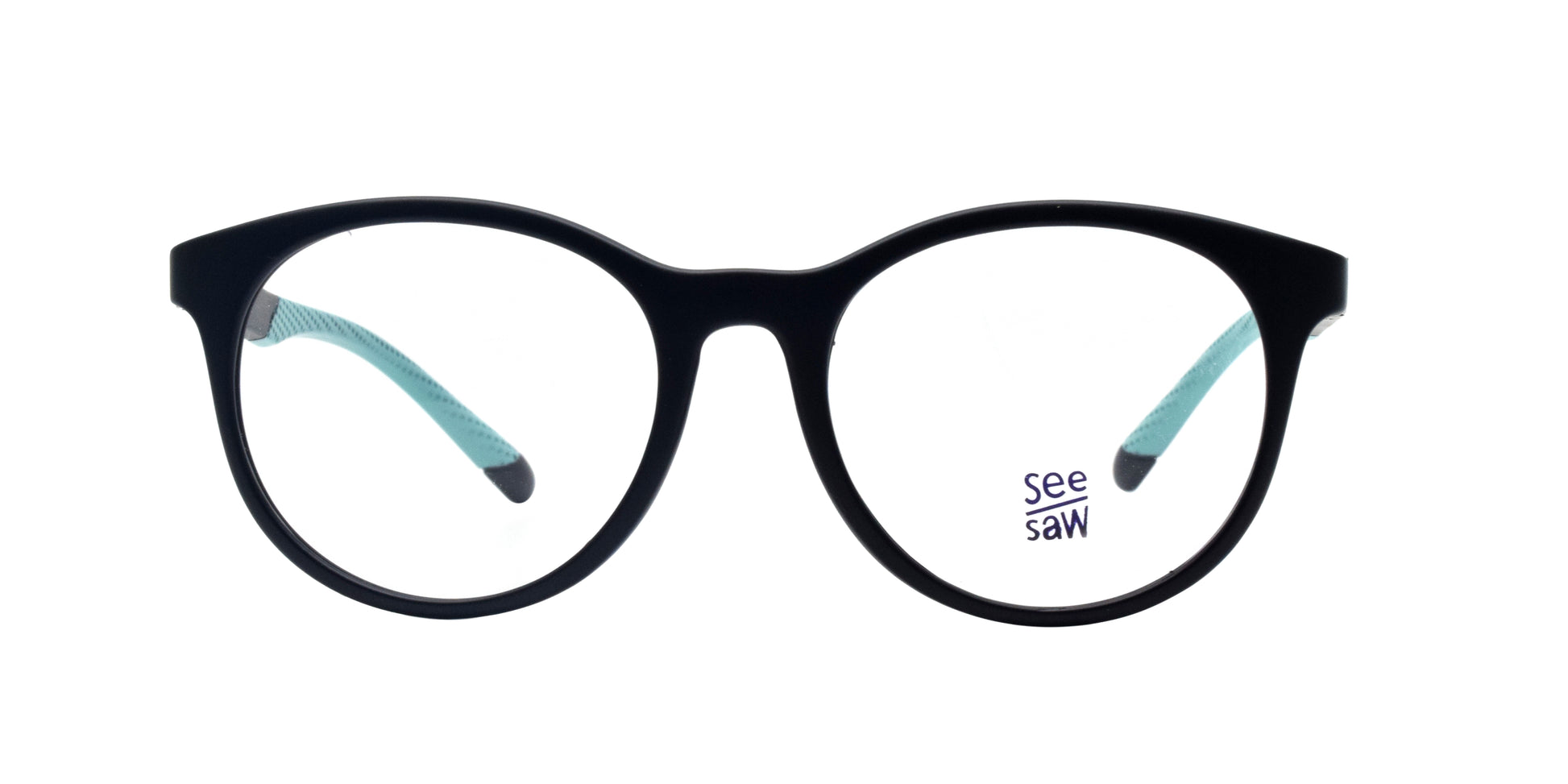 The SEE SAW SS3029 C1 46/16 130 is a durable and stylish children's eyewear option, featuring a full frame design and a fixed nose for a secure fit. Made with quality plastics, this frame is both lightweight and comfortable. The classic round shape and black frame with a fun pop of green make these glasses a must-have for any active child.
