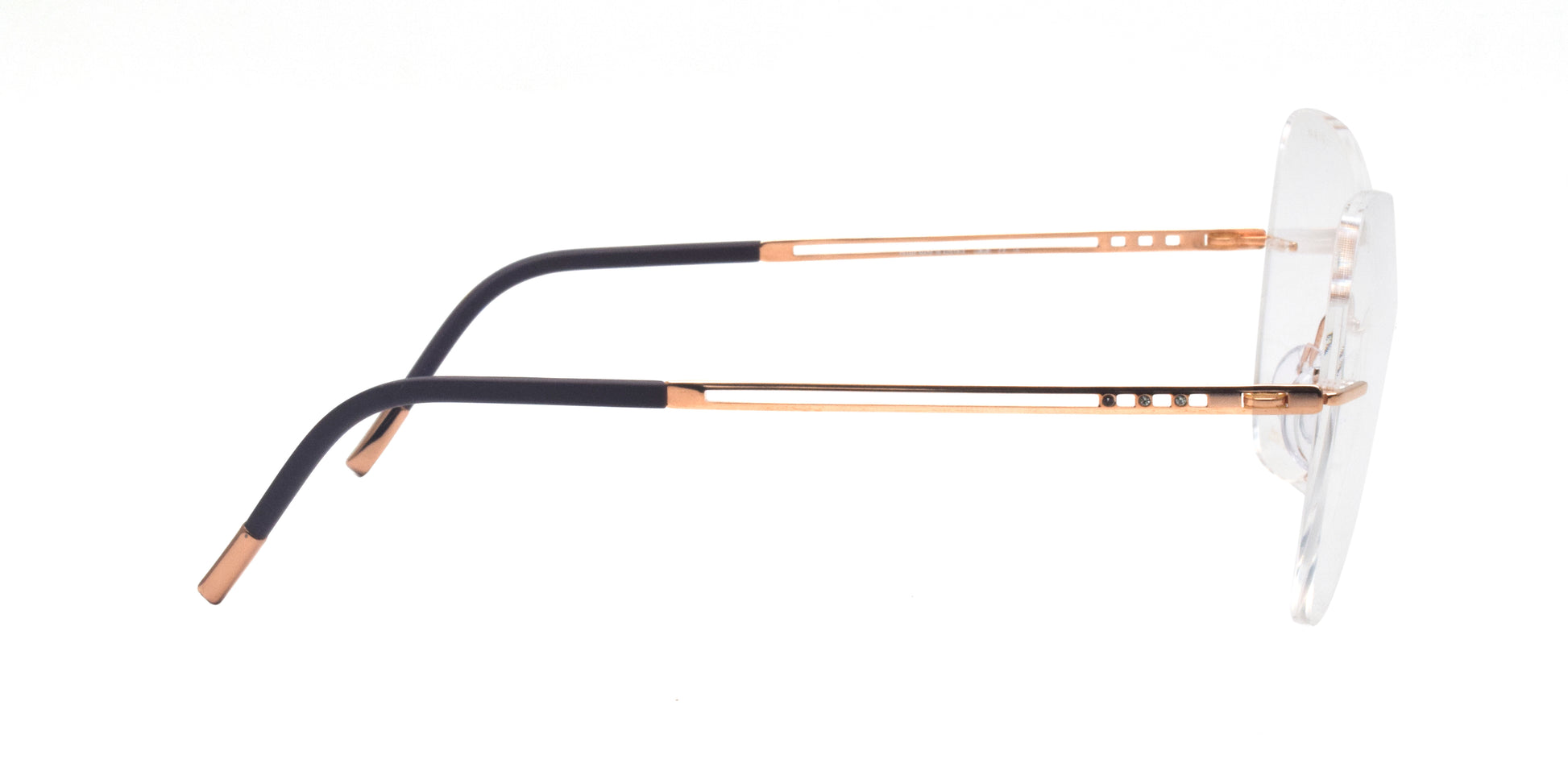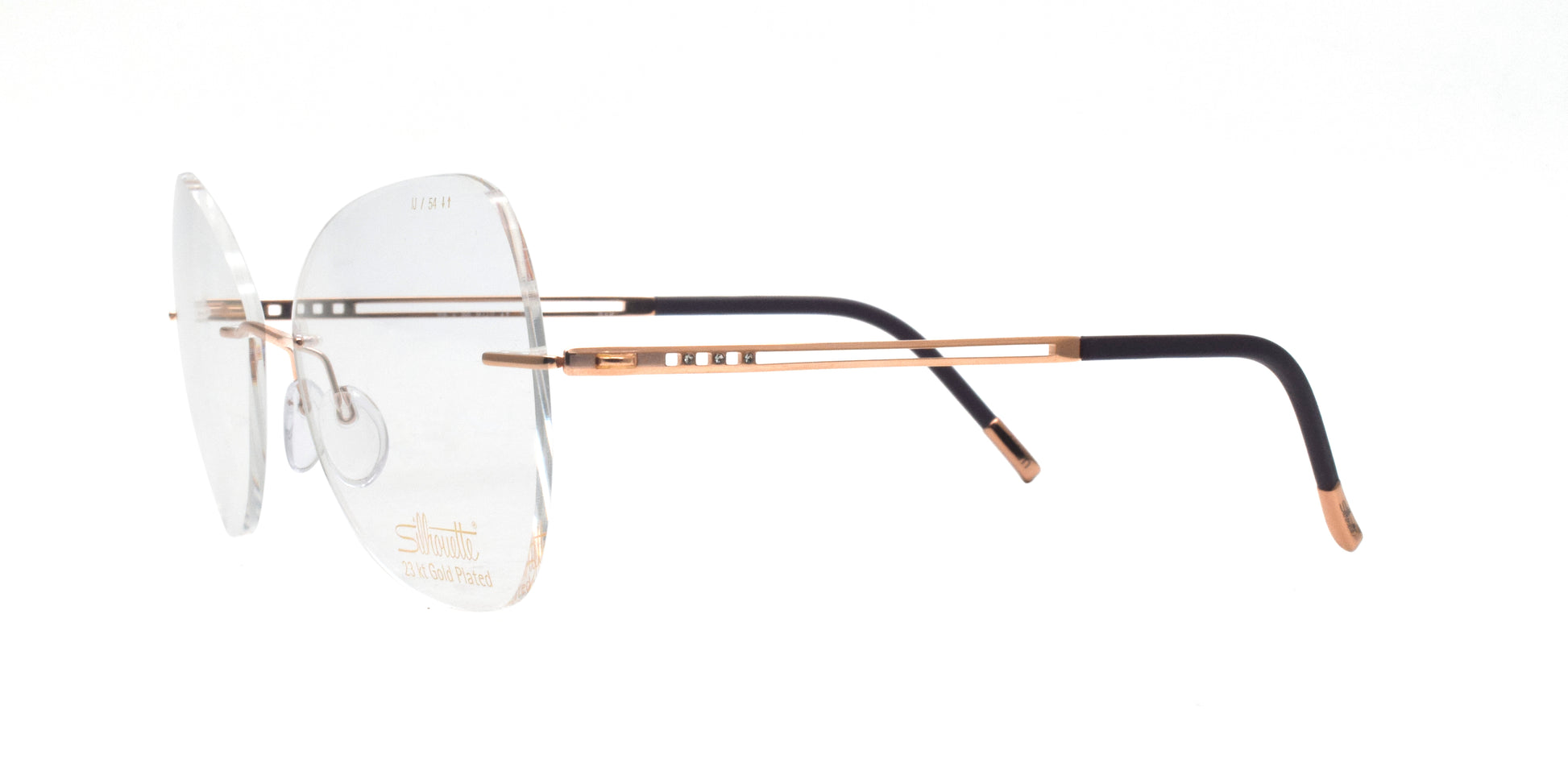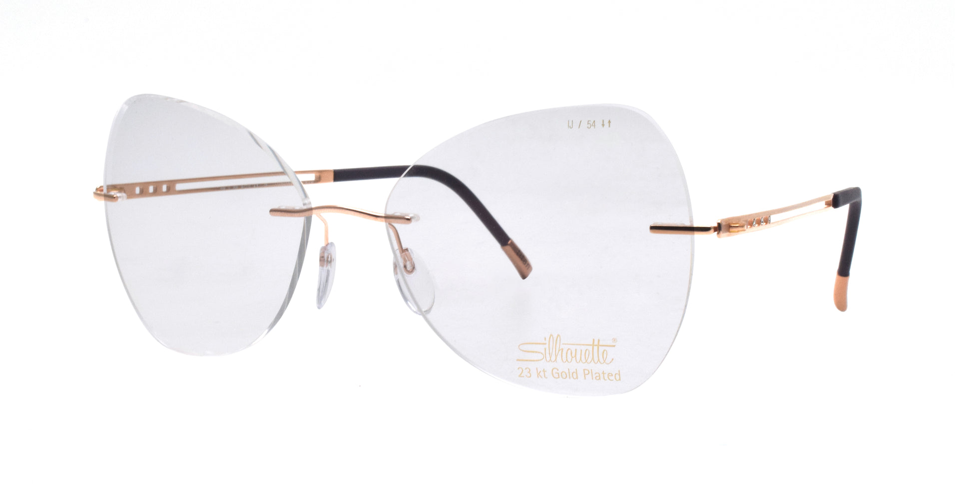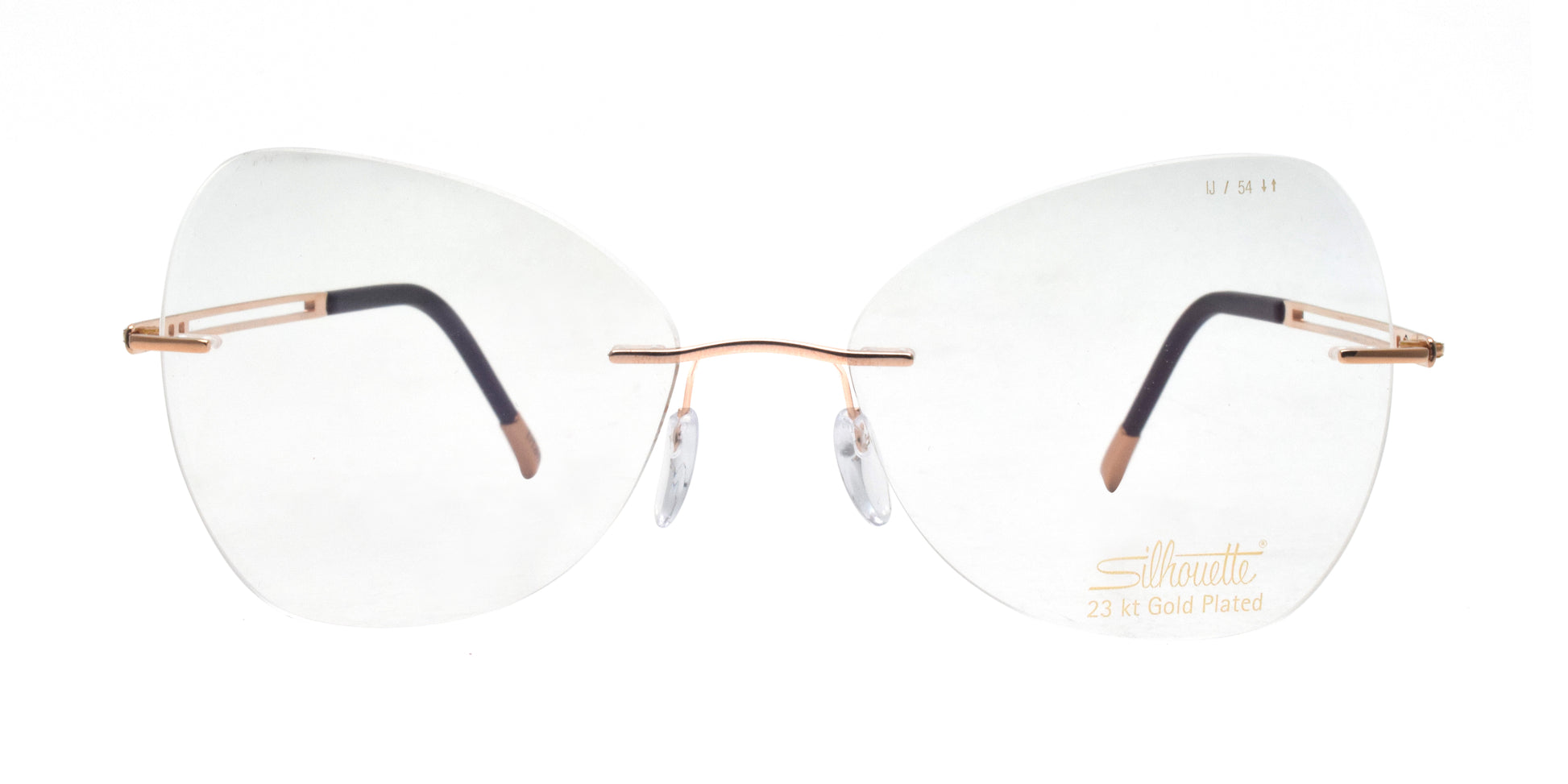 The SILHOUETTE 5536IJ 3520 54/17 135 is a sleek, rimless frame designed for female wearers. Made from high-quality metals and embellished with 23 kt gold plating, this cat eye frame exudes elegance. Its moving nose design provides a comfortable and secure fit, making it both stylish and practical.